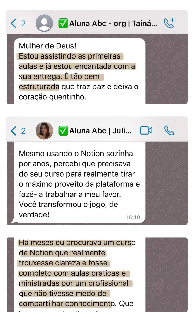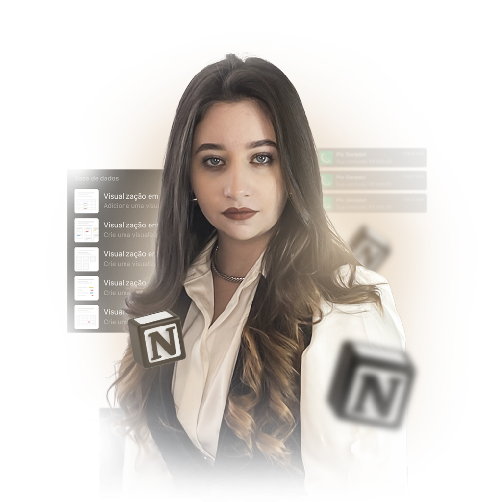 Especialista em Notion, ela já ajudou mais de 70 mentoras e infoprodutoras a estruturarem seus conteúdos de forma clara e funcional, e tem alunas em 5 países.